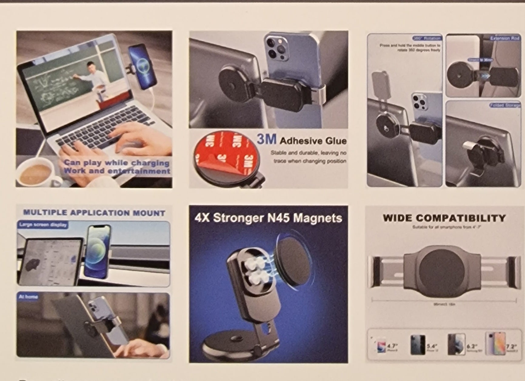 • Styrkur og öryggi: Öflugir seglar sem halda tækinu á sínum stað. Svo er öflug tvöfalt lím sem heldur standi á skjá.